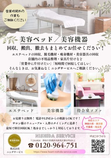 エステベッドの回収、脱毛機材の回収・痩身機材の回収・美容・器具の回収・店舗内の不用品整理・片付けなど
