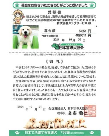 盲導犬育成団体への寄付を行っています。