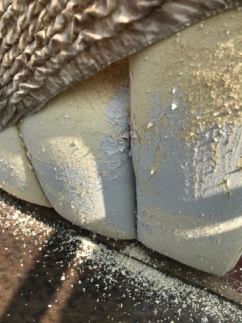 ソファーは下の画像をご覧いただくとわかりますが、革が剥けかかっていて少しでも左右に揺らしただけでポロポロと落ちる状態でした。案の定、私どもが現場のマンション内で運んでいる最中に革の破片が落ちてしまいましたので、マンションの外へ運び出した後、念入りに掃き掃除をいたしました。