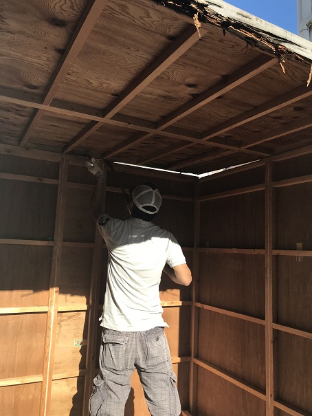 そこで木造の物置の解体に要する時間と労力を考慮し、準備の際にディスクグラインダー、ドラム式リール、バール数本などを用意しました。実際のところ、木と木との連結部分のほとんどがプラスのネジで留められてあるだけだったのでこれらの道具を使うことなく、インパクトドライバーとバールを使うだけで解体作業を進めていくことができました。