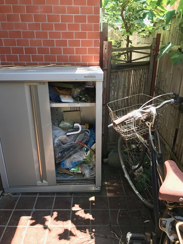 画像をご覧のように、玄関前に設置している物置の中には様々な物が収納されております。今回はこの物置本体と中身をすべて回収、処分いたしました。